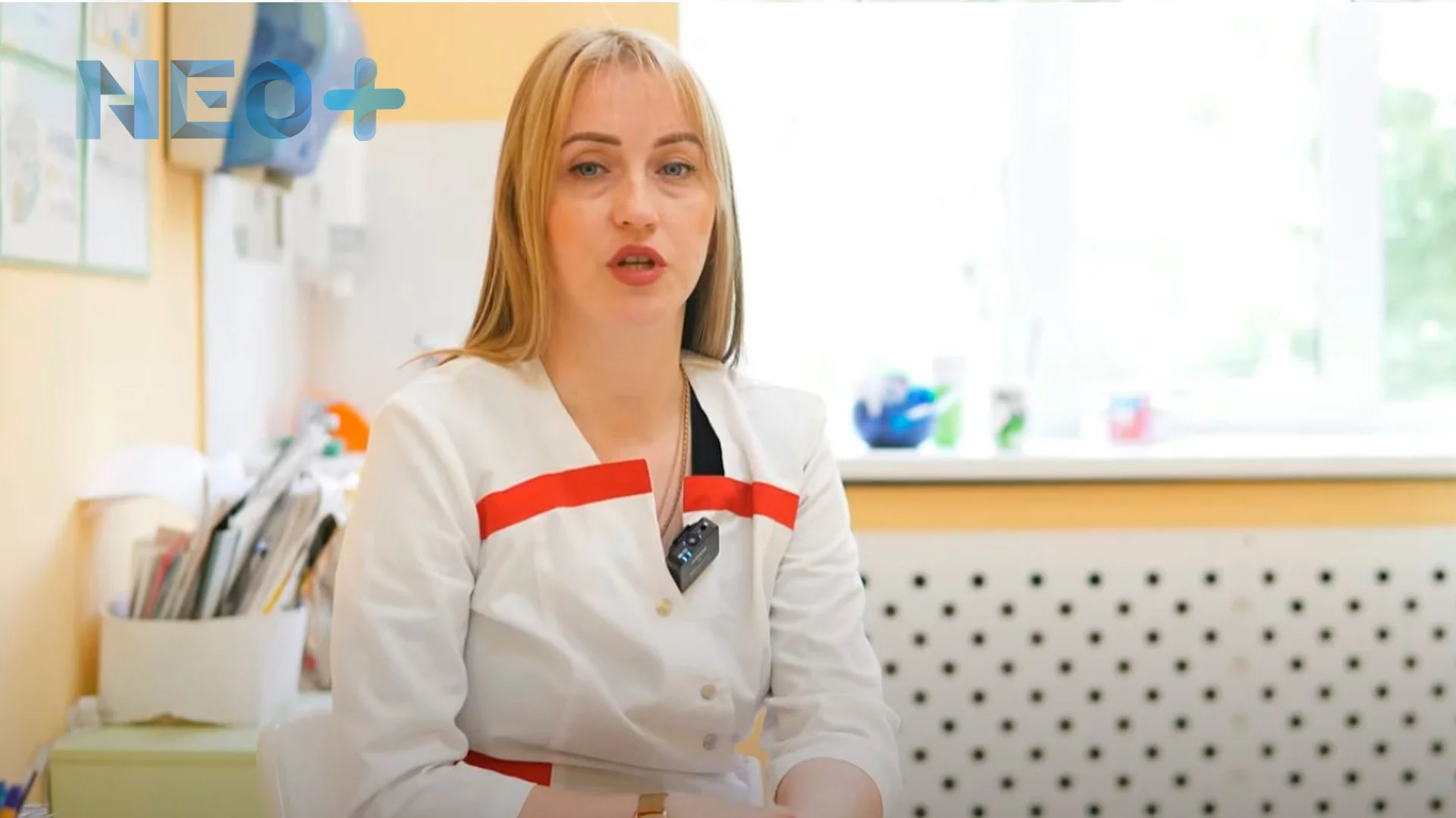 женщина врач в белом халате смотрит в камеру